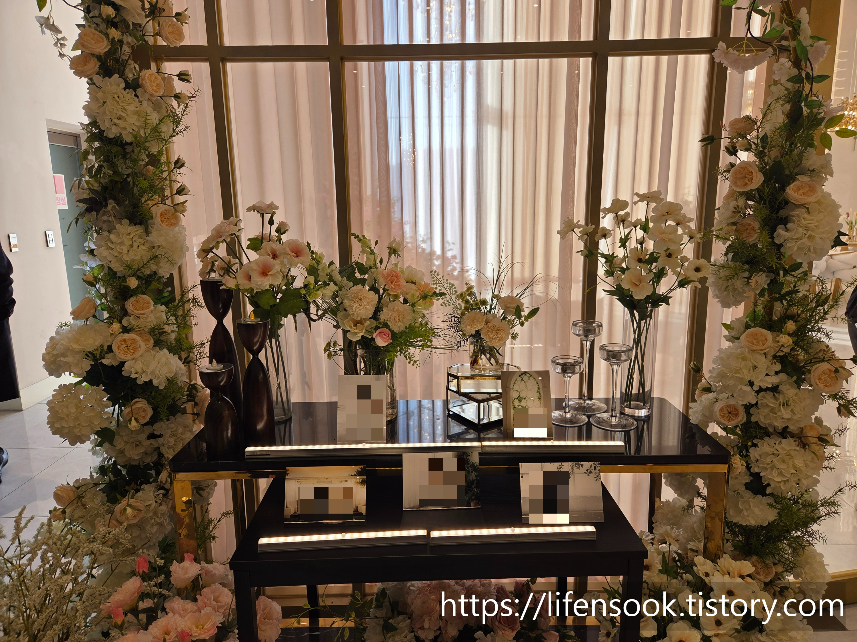 신랑 신부 축의대가 붙어있고 좀 비좁은 느낌이다. 난 일찍 도착해 번잡하지 않았지만, 예식 시간이 가까워지니 많이 혼잡했다.